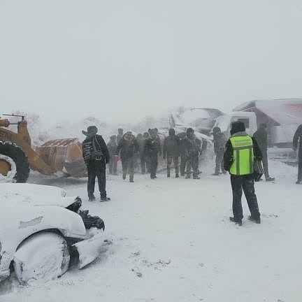 В районе происшествия наблюдается сильная метель. Ведутся работы по разбору скопившегося на месте аварии автомобильного транспорта.