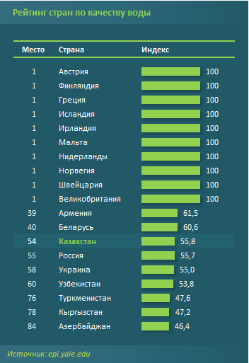 В рейтинге стран мира по качеству воды, учитывающем клинически зарегистрированные случаи любого ущерба здоровью, к которым могло иметь отношение качество потребляемой воды, Казахстан занял 54-е место из 179, пишет energyprom.kz.