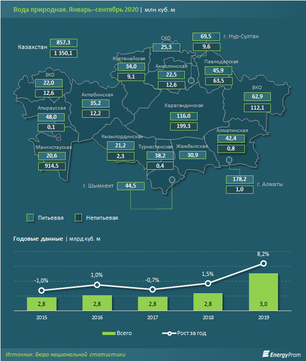 Объем поставляемой казахстанцам природной воды за январь-сентябрь 2020 года составил 2,2 млрд куб. м — на 0,7% больше, чем годом ранее. Для справки: за полный 2019 год показатель составил 3 млрд куб. м — на 8,2% больше, чем в предыдущем году.