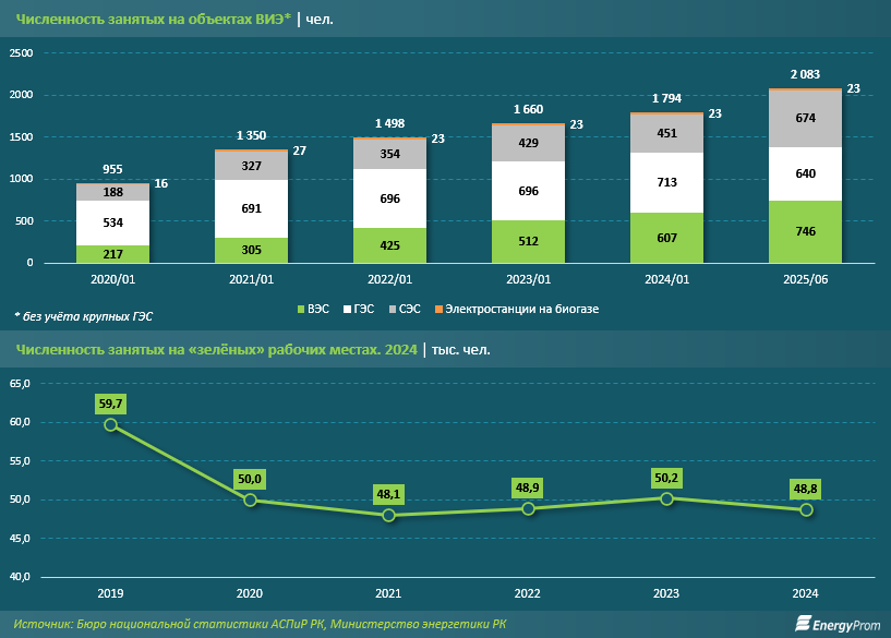 При этом сотрудники предприятий возобновляемой энергетики составляют лишь часть занятых на так называемых "зелёных" рабочих местах - то есть в организациях, деятельность которых связана с сохранением или восстановлением окружающей среды. По данным БНС, в 2024 году общее число таких работников в Казахстане достигало примерно 48,8 тыс. человек.