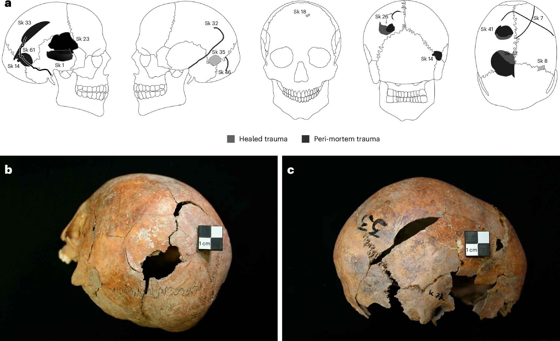 Фото: a-c) распределение и примеры черепно-мозговых травм, зафиксированных в Гомолаве / © Linda Fibiger