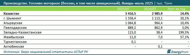 За январь–июль текущего года в Казахстане произвели 3,4 млн тонн моторного топлива (бензина, в том числе авиационного) — на 14,4% больше, чем за аналогичный период 2024-го, сообщает inbusiness.kz со ссылкой на Еnergyprom.kz.