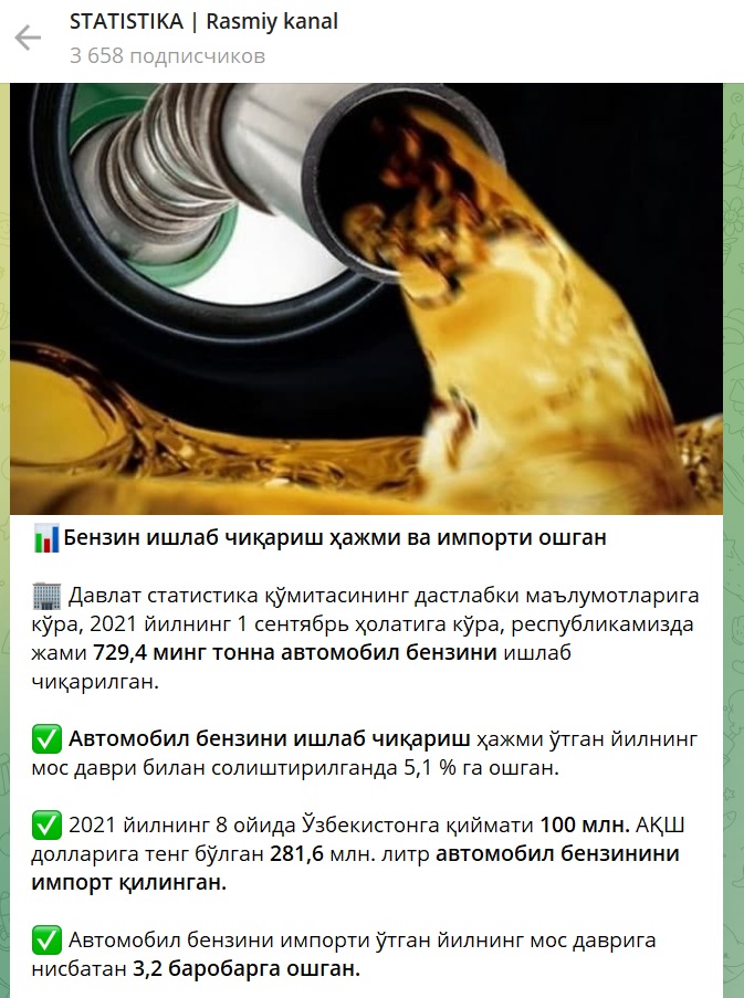 По официальным данным Госкомстата на 1 сентября, в Узбекистане за первые восемь месяцев года произведено 729,4 тысячи тонн бензина (около 992,4 млн литров), что на 5% больше, чем в аналогичном периоде прошлого года. При этом за это время импортировано 281,6 млн литров бензина (около 22% от общего потребления бензина в стране) на 100 млн долларов, что в 3,2 раза выше показателя прошлого года.
