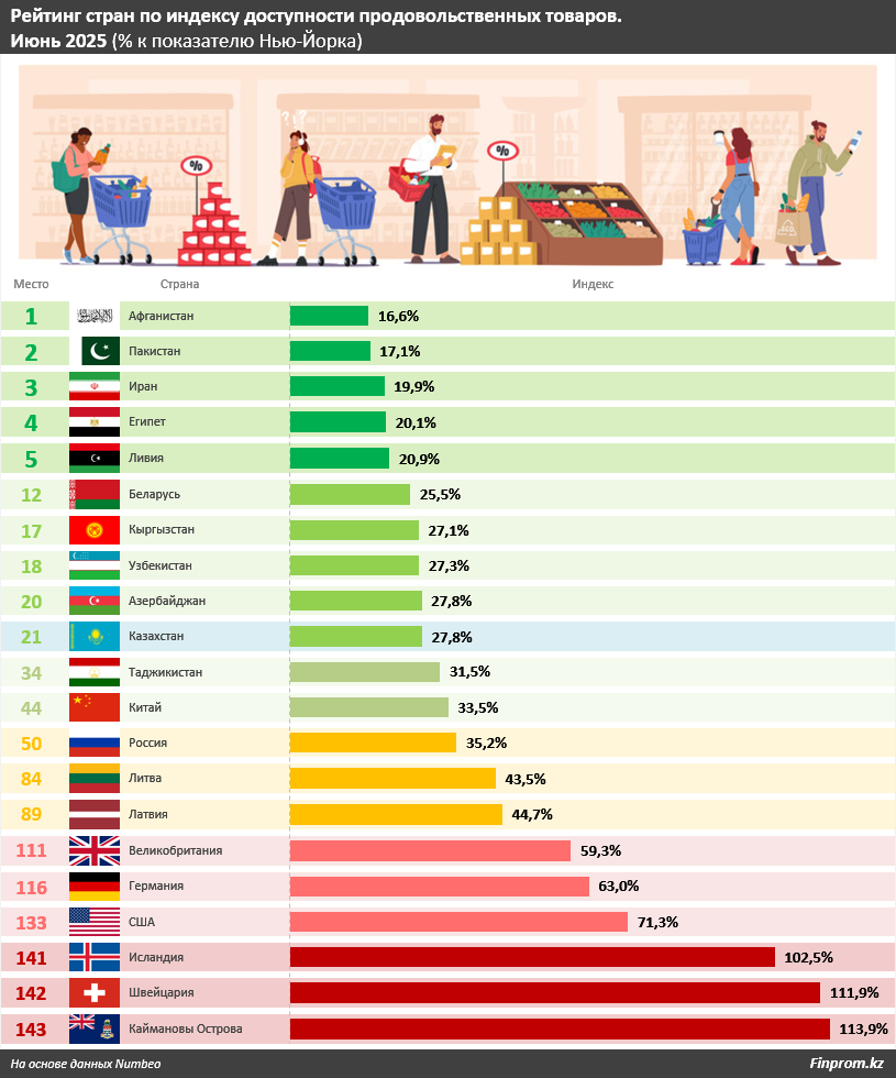 Развитые государства Европы и Северной Америки, а также отдельные островные страны, по версии Numbeo, являются территориями с самыми высокими ценами на продукты питания. Самый высокий индекс доступности продовольствия в июне 2025-го пришёлся на Каймановы Острова: 113,9%. Далее следуют Швейцария (111,9%) и Исландия (102,5%). В США в среднем цены ощутимо ниже, чем в "дорогом" Нью-Йорке: 71,3%. В целом в европейских странах стоимость продуктов питания хоть и не так велика, как в Нью-Йорке, но всё же куда выше, чем в Казахстане.