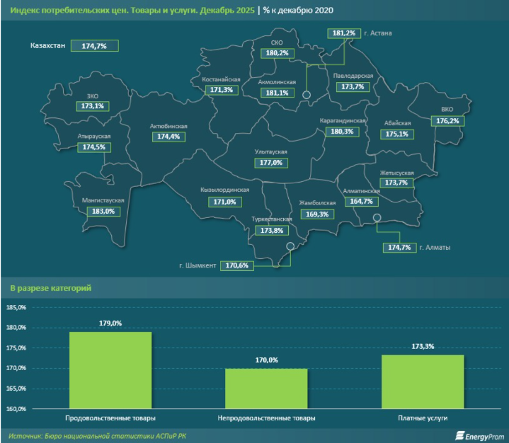 За последние пять лет средний рост цен для казахстанцев составил 74,7%, что формирует долгосрочное давление на потребительскую корзину и сказывается на бюджете каждой семьи. Особенно значительное удорожание пришлось на пандемийный 2020 год, когда экономика сталкивалась с локдаунами, ограничениями на передвижение и сбоями в глобальных цепочках поставок, передает inbusiness.kz со ссылкой на Еnergyprom.kz.