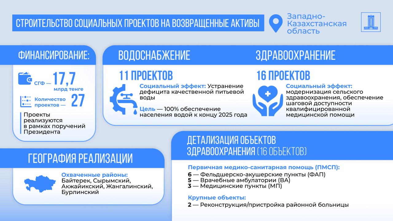 "В Западно-Казахстанской области продолжается реализация поручений президента по строительству и реконструкции социальных объектов на возвращенные активы. Из средств Специального государственного фонда региона выделено 17,7 млрд тенге на реализацию 27 проектов", - сообщили в пресс-службе премьера Казахстана.