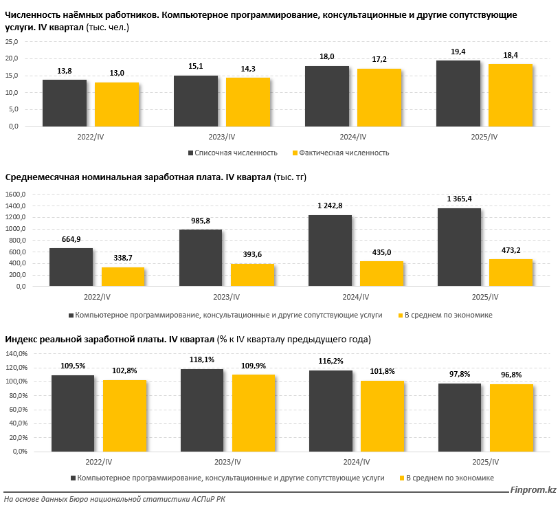 Число работников в IT-секторе Казахстана выросло на 41% за три года, достигнув 19,4 тыс. человек в 2025 году. Средняя заработная плата в отрасли также значительно увеличилась и составила 1,4 млн тенге в четвертом квартале, что в 2 раза больше, чем в 2022 году, передает inbusiness.kz со ссылкой на finprom.kz.