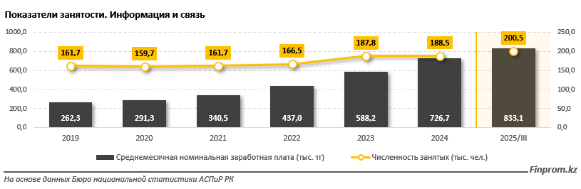 Казахстан продолжает развитие IT-сектора, что положительно сказывается на социальной сфере. По данным бюро национальной статистики (БНС), численность сотрудников, занятых в области информации и связи, в третьем квартале 2025 года составила 200,5 тыс. человек, что на 40,5 тыс. больше, чем пять лет назад, когда этот показатель был около 160 тыс. человек.