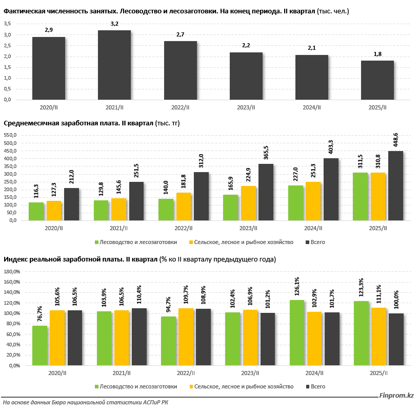 "Покупательная способность зарплат в отрасли также показала заметный рост: сразу на 23,3% за год. При этом в среднем по экономике показатель вовсе не изменился. Однако, несмотря на опережающую динамику, уровень оплаты труда в сфере лесоводства и лесозаготовок всё ещё ниже среднереспубликанского: разрыв во втором квартале 2025 года составил чуть более 30%", - говорится в исследовании.