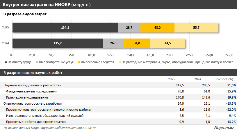 Почти половина прироста расходов на науку в Казахстане за прошлый год пришлась на фонд оплаты труда. Затраты на зарплаты научных сотрудников достигли 134,1 млрд тенге, заняв 51,3% в общей структуре расходов на НИОКР. Рост составил 16,4% - как за счёт индексации выплат, так и увеличения численности исследователей на 4,5%.