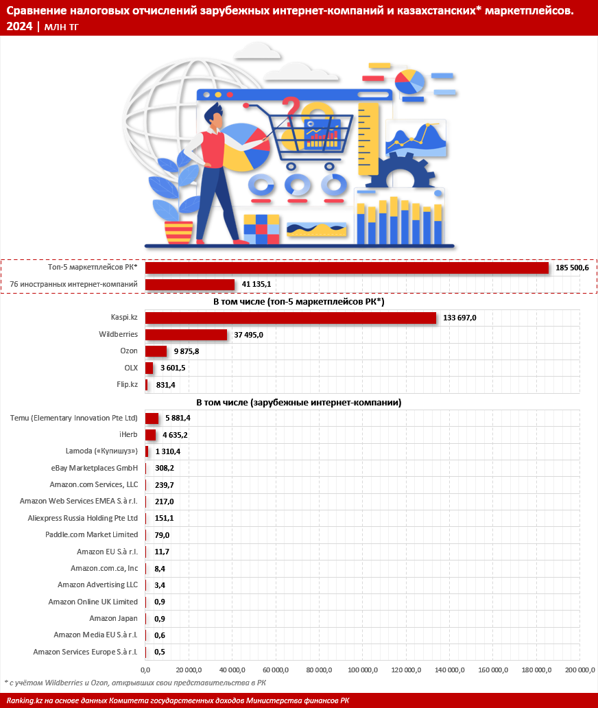 Итак, по итогам 2024 года 76 иностранных интернет-компаний суммарно заплатили в бюджет РК около 41 млрд тг. Ещё раз отметим: в этот список входят мировые IT-гиганты и онлайн-маркетплейсы. При этом, также для сравнения, отметим несколько маркетплейсов: к примеру, Temu за весь 2024 год выплатил налоги в сумме 5,9 млрд тг, iHerb — 4,6 млрд тг, Lamoda ("Купишуз") — 1,3 млрд тг, eBay Marketplaces GmbH — 308,2 млн тг, Aliexpress Russia Holding Pte Ltd — 151,1 млн тг.