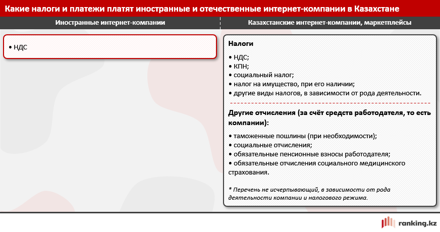"Далее наглядно покажем разницу между налоговыми отчислениями казахстанских и зарубежных компаний (плательщиков "налога на Google"), осуществляющих деятельность онлайн-способом", - пишет Ranking.kz.