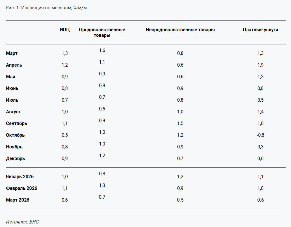 "Темпы месячной инфляции в марте резко замедлились почти в два раза, по сравнению с предыдущим месяцем, при этом все компоненты потребительской корзины стали заметно ниже как в месячном, так и в годовом выражении. Угасание эффекта от повышения налоговой нагрузки, продолжительное укрепление курса национальной валюты в сочетании со слабым внутренним спросом и заморозкой тарифов на услуги ЖКУ, бензин и другое топливо способствовали более вялому росту цен в марте", — отметил эксперт.