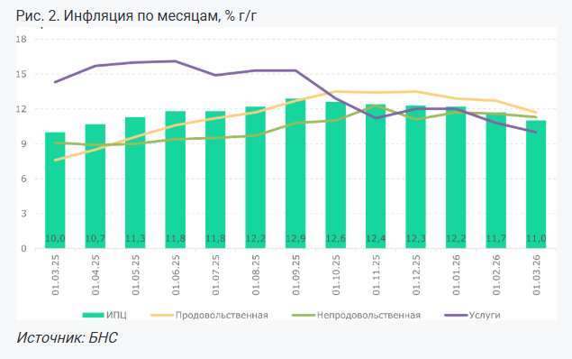 В годовом выражении инфляция также демонстрирует замедление, достигнув 11% в марте. Этот тренд сохраняется уже шесть месяцев подряд. По итогам первого квартала 2026 года, инфляция составила 2,7% против 3% в предыдущем квартале.