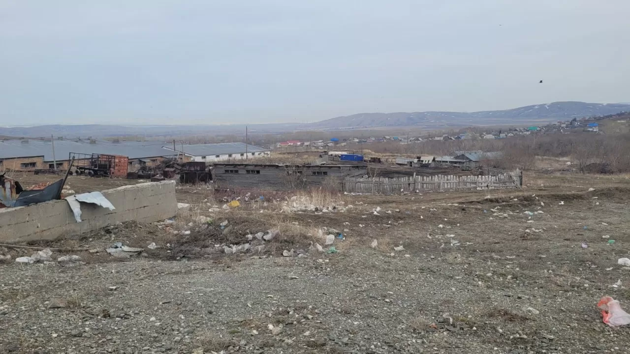 "Вот эта куча навозная возле республиканской трассы. 20-30 метров от деревни свиной навоз. Сюда каждый год валят. Когда весной снег тает вода, через середину деревни льется прямо в рекц Ульбу", - говорит житель села Степное Кабизолда Конырбаев.