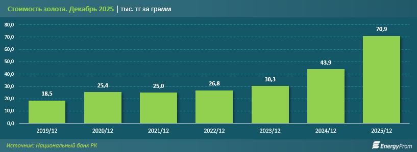 Уже в декабре 2023-го стоимость золота увеличилась на 13,3% за год, до 30,3 тыс. тг за грамм. По итогам 2024 года рост был значительно более выраженным: сразу на 45%, до 43,9 тыс. тг за грамм. В 2025-м рост цен на золото продолжился: по состоянию на конец года его стоимость увеличилась ещё на 61,4%, до 70,9 тыс. тг за грамм.