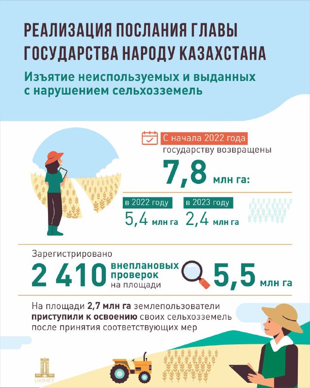 В рамках реализации послания президента Касым-Жомарта Токаева с начала 2022 года государству возвращено 7,8 млн гa неиспользуемых и выданных с нарушением сельхозземель, передает inbusiness.kz со ссылкой на пресс-службу правительства.