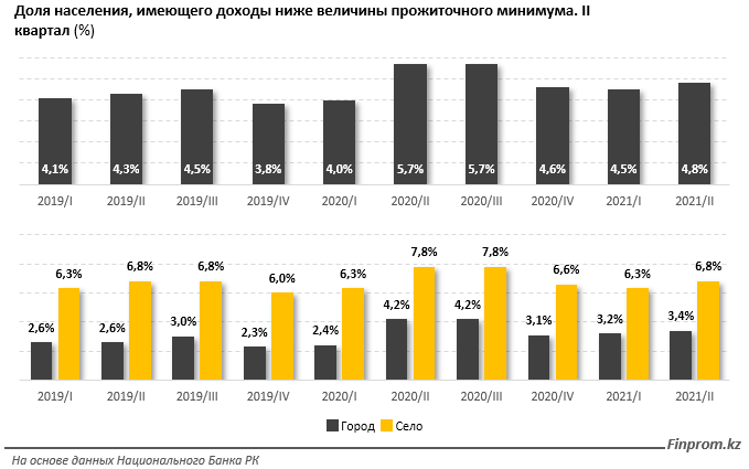 Во втором квартале текущего года доля населения, имеющего доходы ниже величины прожиточного минимума, составила 4,8% – на 0,9 п. п. меньше, чем во втором квартале 2020-го, при этом на 0,3 п. п. больше по сравнению с первым кварталом 2021 года, передает inbusiness.kz со ссылкой на портал finprom.kz.