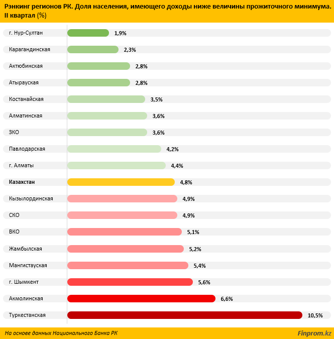 Лишь в 2 из 17 регионов РК уровень бедности по сравнению с прошлым годом повысился: в Мангистауской области (на 1,1 п. п., до 5,4%) и в столице (на 0,5 п. п., до 1,9%, что, впрочем, все еще является наилучшим показателем по РК).
