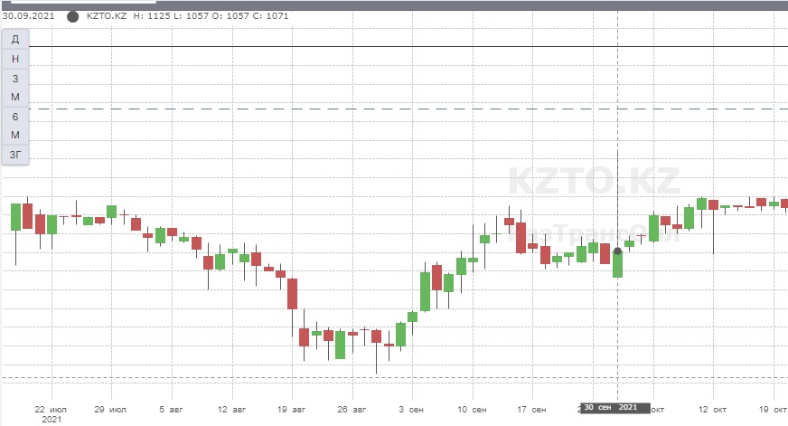 С 16 по 30 сентября наблюдалось снижение котировок с откатом на закрытии последнего дня осени до 1071 тенге за акцию. Однако в этот же день был зафиксирован хай 1125 тенге, сопоставимый с июньскими котировками.