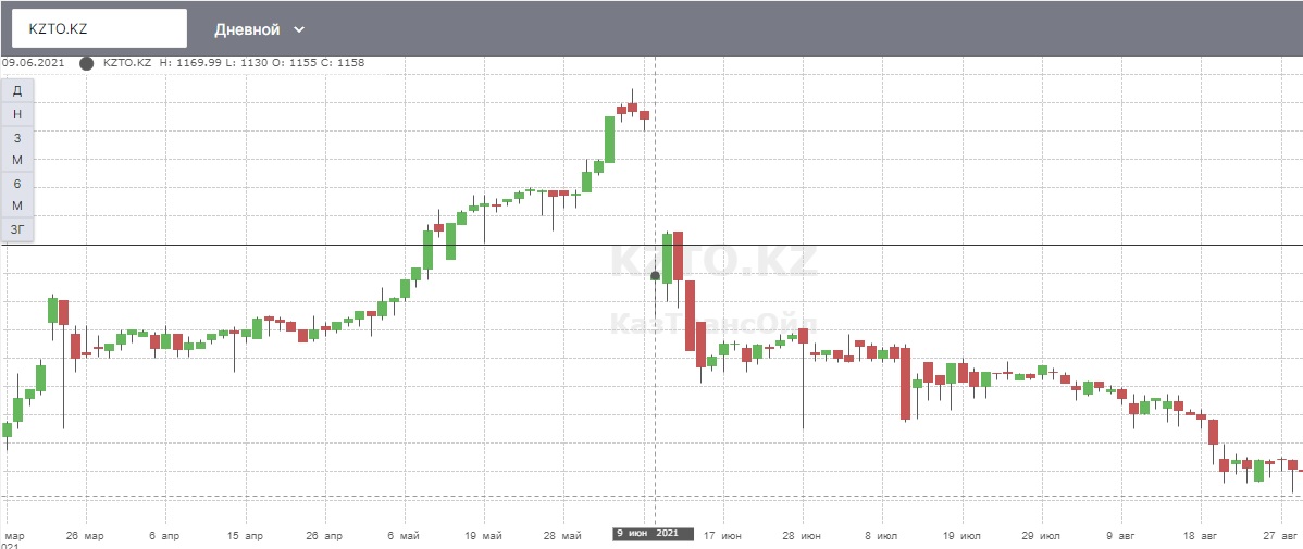 Напомним, после дивидендной отсечки в начале лета акции КТО, как это обычно и бывает, просели. Если 8 июня рынок закрылся на уровне 1268,9 тенге за акцию (хай дня – 1274 тенге), то на следующий день торги начались с 1155 тенге.