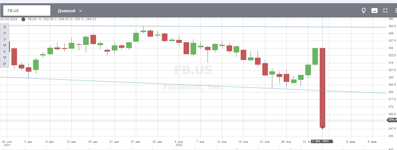 За торговый день с $330,0 на открытии акции FB.US рухнули до $249,12 на закрытии, показав лоу дня $246,67. Капитализация компании снизилась более чем на 23%.