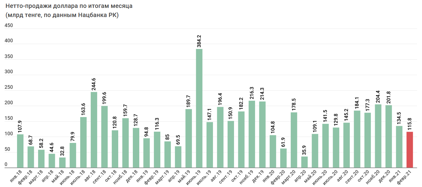 Причем февраль стал третьим подряд месяцем, в течение которого отмечается поступательное снижение спроса на американскую валюту. По сравнению с ноябрем нетто-продажи снизились более чем на 43%, или 88,6 млрд тенге.