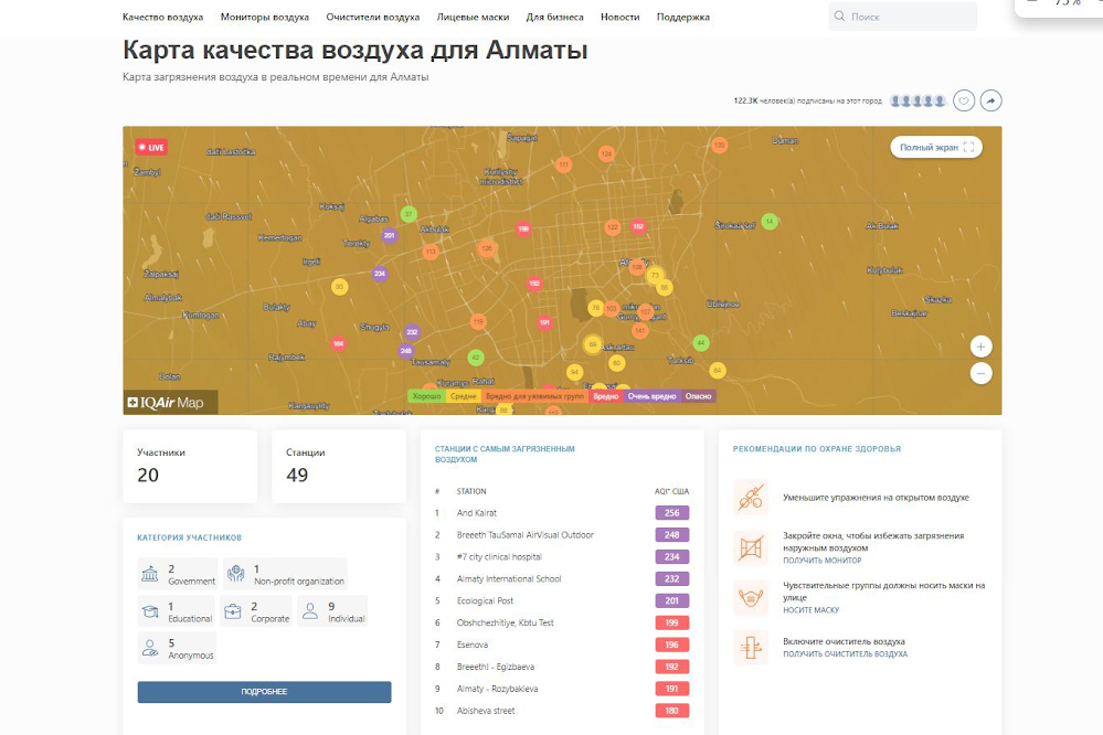Несмотря на то, что с приходом холодов качество воздуха в нашем города заметно ухудшилось, лидером по показателям загрязненности атмосферы, на сегодняшний день, стал город Багдад – столица Ирака, где индекс качества воздуха (AQI) превысил показатели в 1000 условных единиц измерения. В Алматы, где на момент написания материала индекс качества воздуха составляет 119, воздух оказался чище чем, например в Ташкенте – 191 единица, но немного хуже, чем в Дохе, столице Катара, где показатели AQI составляют 118 единиц. Как уже сообщалось, в ТОП-20, по уровню загрязнения, закрепилось сразу несколько городов Индии, Пакистана, а также мегаполисы соседнего Китая.