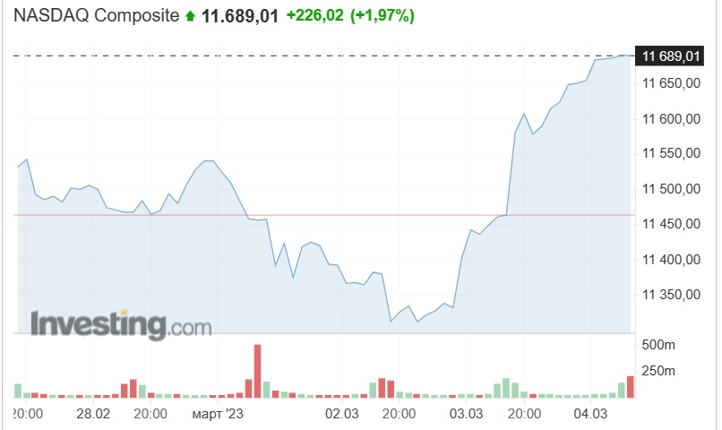 С понедельника, 27 февраля, по среду, 1 марта, американские индексы снижались. Были они в минусе и в начале торгов 2 марта. Негатива инвесторам добавила информация минтруда США о сильном рынке труда. И вот в этот день президент Федерального резервного банка Атланты Рафаэль Бостик выступил с заявлением, в котором трейдеры увидели "голубиные" сигналы. Он сказал, что поддержал бы повышение базовой процентной ставки на 25 базисных пунктов на мартовском заседании. Бостик, который не имеет права голоса по вопросам ставки в 2023 году, отметил, что Федрезерву следует действовать осторожно, с учетом отложенного эффекта ужесточения денежно-кредитной политики, который может проявиться в скором времени. Акции пошли вверх. Ралли продолжилось и в пятницу. Импульса к росту добавило снижение доходности по 10-летним бондам, которая вернулась к отметке ниже 4% после достижения 4-месячного максимума днем ранее на ралли, вызванным беспокойством инвесторов по поводу того, что Федеральная резервная система будет дольше удерживать ставку на высоком уровне.