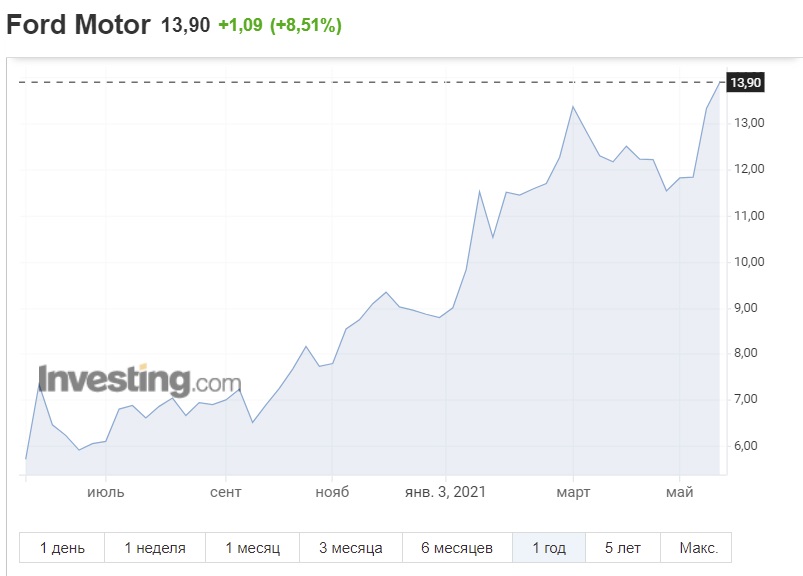 Лидером вчерашнего дня среди эмитентов S&P 500 стала компания Ford, акции которой выросли на 8,51%. Автопроизводитель намерен наращивать инвестиции в производство электромобилей. Если ранее к 2025 году в это направление планировалось вложить порядка 22 млрд долларов, то теперь компания собирается увеличить сумму до 30 млрд долларов. К 2030 году компания планирует довести долю электрокаров в общем объеме производства до 40%. Ранее inbusiness.kz писал, что после падения в марте 2020 года до менее 5 долларов за акцию в течение следующего года стоимость бумаг возросла более чем в 2 раза, до 12,5 доллара в начале марта 2021 года. Сейчас акции Ford стоят более 14 долларов.