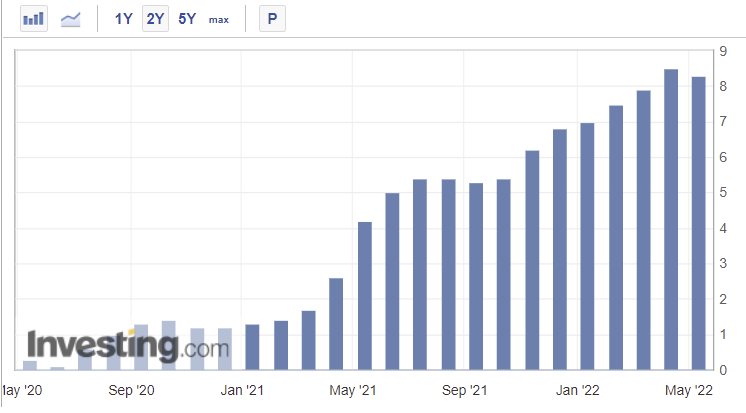 Хотя большинство факторов, разогнавших ее до рекордных уровней, по-прежнему остаются. Это и разрывы в цепочках поставок, которые частично усугубились после начала войны в Украине, дорогие энергоносители, в первую очередь нефть, которая все еще стабильно торгуется выше 100 долларов за баррель. На этом фоне стоимость бензина в США продолжает обновлять исторические рекорды, достигнув уже 4,404 доллара за галлон.