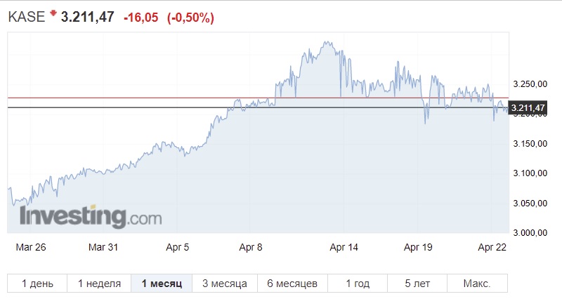 Что касается Казахстана, то продолжает корректироваться индекс KASE. С начала нынешней недели казахстанский индекс выдает только отрицательные торговые сессии, а с учетом сегодняшней это может быть уже четвертая кряду. По крайней мере, пока, по состоянию на 15:20 времени Нур-Султана, индекс KASE торгуется с -0,50% на отметке в 3211,47 пункта. Всего за последние десять дней индекс Казахстанской фондовой биржи растерял более 3,1%.