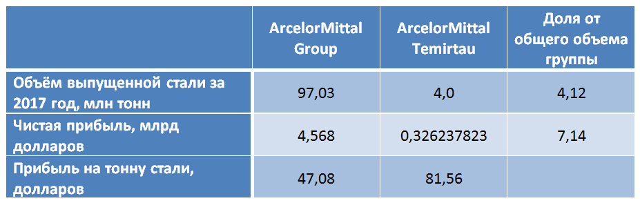 В общей чистой прибыли глобального ArcelorMittal за 2017 год в 4,568 млрд долларов доля "АрселорМиттал Темиртау" (комбината с весьма престарелым оборудованием) составляет целых 7,14%. Притом что доля выпущенной стали почти в два раза меньше – 4,12%.