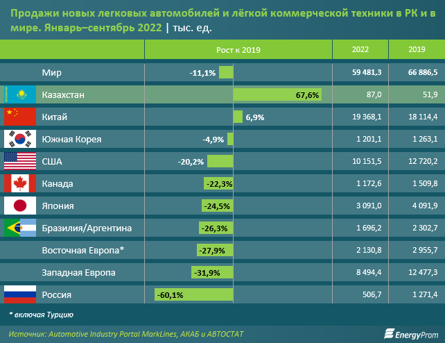 Продажи новых легковых автомобилей и легкой коммерческой техники в мире тем временем практически приблизились к показателям прошлого года, составив за январь–сентябрь 2022 года 59,5 млн авто — лишь на 2% меньше. При этом по сравнению с "докоронакризисным" 2019 годом продажи все еще ниже на 11,1%. Так, автопродажи в США в январе–сентябре текущего года по сравнению с аналогичным периодом 2019 года оказались меньше на 20,2%, в Японии — на 24,5%, а в странах Западной Европы — сразу на 31,9%. В соседней России продажи в 2022 году сократились в сравнении с 2019-м и вовсе на 60,1%.