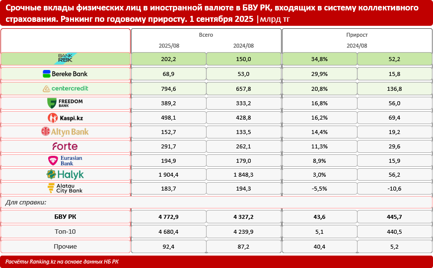 Абсолютный лидер по годовому росту срочных вкладов населения в иностранной валюте среди крупных банков Казахстана — Bank RBK: плюс 34,8%, до 202,2 млрд тенге. Для справки: совокупный объем срочных вкладов как в иностранной, так и в национальной валюте в этом банке вырос на 27,9%, до 538,9 млрд тенге. В свою очередь, вклады физлиц увеличились на 17,1% за год, до 609,9 млрд тенге, а общий депозитный объем, включающий вклады населения и бизнеса, — на 16%, до 1,5 трлн тенге.