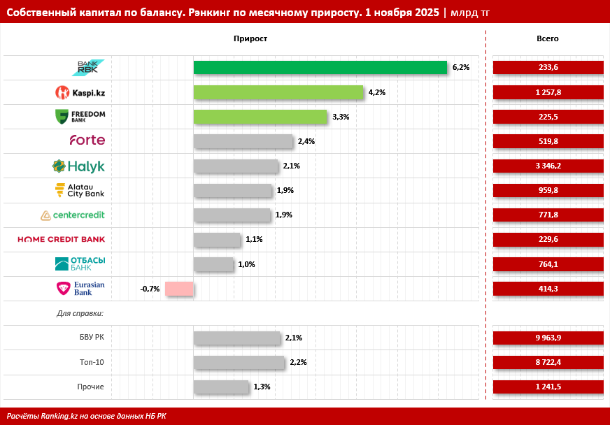 В разрезе БВУ РК по месячному росту собственного капитала по балансу уверенно лидирует с заметным отрывом Bank RBK — плюс 6,2%, до 233,6 млрд тг. За год банк прибавил уже 17,9%.