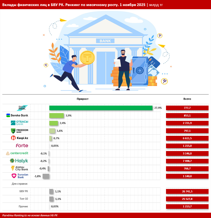 Примечательно, что почти 96% розничных вкладов сконцентрированы в ведущей десятке БВУ РК: это уже 25,5 трлн тг, плюс 1,1% за месяц. В прочих банках суммарный объем депозитов физлиц составил всего 1,2 трлн тг, увеличившись лишь на 0,03%. При этом только 11 из 23 казахстанских банков удалось удержаться в плюсе в месячной динамике.