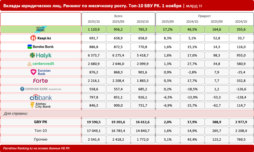 Абсолютным лидером по месячному росту в топовой десятке банков — держателей вкладов бизнеса стал Bank RBK: сразу плюс 17,2%, до 1,1 трлн тг. Эта позитивная динамика для Bank RBK — стабильное явление: фининститут лидирует по росту вкладов бизнеса и в годовой динамике, прибавив в сравнении с 1 ноября 2024-го сразу 46,5%. Это также заметно больше, чем в среднем по сектору, а также чем в среднем по крупным БВУ РК. Подобная ведущая позиция наглядно подчеркивает высокий уровень доверия казахстанских предпринимателей к этому банку.