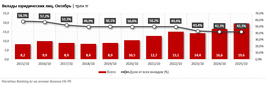И еще один важный момент: вклады юрлиц третий год занимают лишь 42-43% совокупного портфеля вкладов в казахстанских банках. В условиях доминирования вкладов населения в депозитном сегменте банки, демонстрирующие активный рост депозитов юридических лиц, выделяются как институты, пользующиеся повышенным доверием со стороны бизнеса.