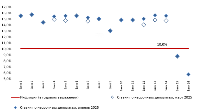 График 1. Ставки, предлагаемые банками по несрочным депозитам (апрель 2025 г.)