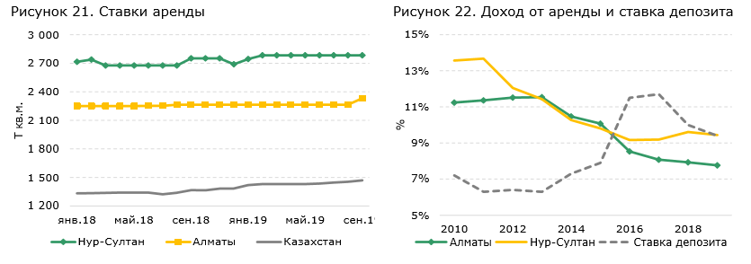 "В результате слабого роста арендных ставок, доходность от сдачи жилья в аренду в г. Алматы опустилась на 0,1% пп 7,8%, в г.Нур-Султан ее значение снизилось до 9,4%", – отмечают в Halyk Finance.