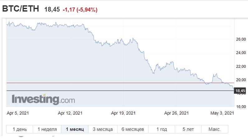 Но наиболее интересный рост продолжает демонстрировать Ethereum. Вторая криптовалюта по-прежнему растет быстрее биткоина, тем самым еще немного сокращая разницу между двумя криптовалютами. Прямо сейчас "эфир" торгуется на уровне своего исторического максимума в 3200 долларов, подорожав только за сегодня на 10,48%, а за последнюю неделю более чем на 30%. Напомним, криптоаналитики ждут от Ethereum роста до 10 тыс. долларов уже в нынешнем году. Таким образом, продолжает падать курс биткоин/эфириум. Так, если в конце 2020 года их соотношение друг к другу составляло около 39 в пользу BTC, то неделей ранее курс держался на уровне 21. Сейчас же он вовсе составляет 18.45.