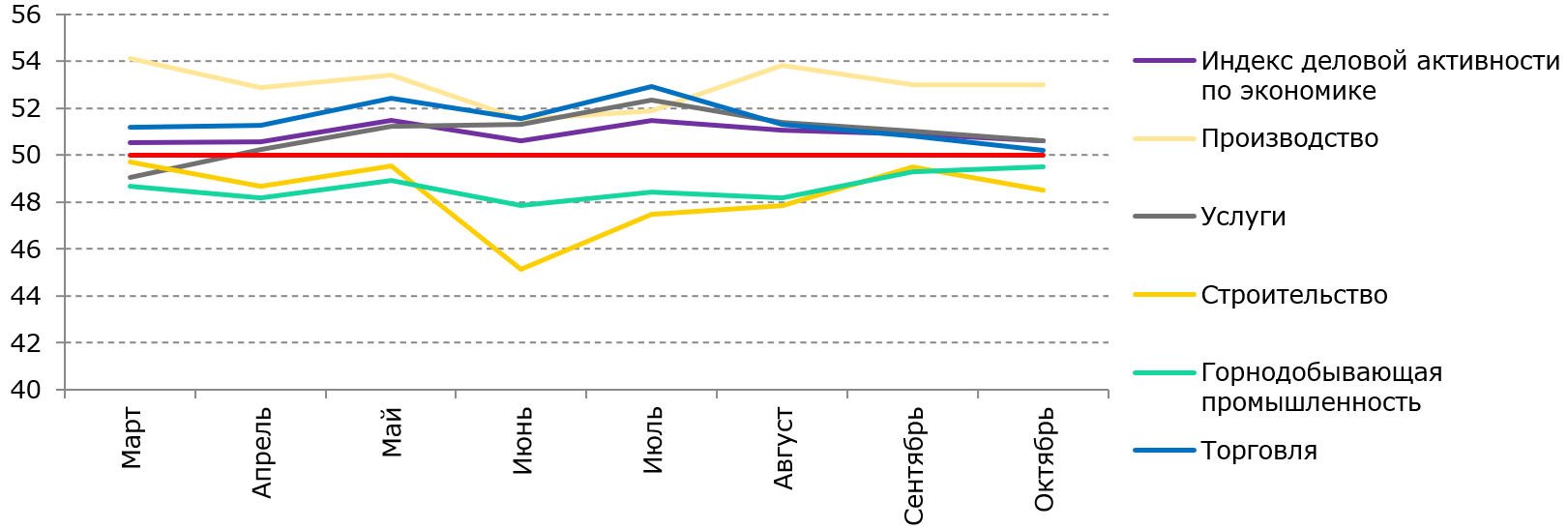 Согласно данным Национального банка (НБК), показатель деловой активности в производстве в октябре составил 53,0, в сфере услуг — 50,6, в торговле — 50,2 (против 52,9, 50,8 и 50,7 месяцем ранее). В строительстве показатель равняется 49,5 (практически без изменений по сравнению с сентябрем), а в горнодобывающей промышленности бизнес отметил ухудшение — 48,5 против сентябрьских 49,4. Таким образом, различные секторы показали неоднородную динамику, но общий индекс находится в позитивной зоне (выше 50) 19-й месяц подряд — с марта 2024 года.