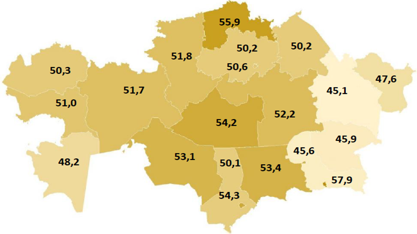 В региональном разрезе лидером стал город Алматы с показателем 57,9, худший результат зафиксирован в области Абай — 45,1. Деловая активность улучшилась в 15 регионах, снизилась в пяти.