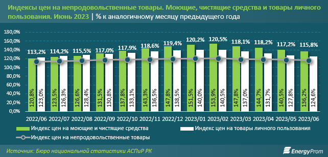 Высокая импортозависимость в секторе отражается и на ценах: удорожание продукции уже давно выходит за пределы средних цифр инфляции. Например, в июне этого года моющие и чистящие средства в РК выросли в цене на 36,2%, товары личного пользования — на 24,6%. При этом общее годовое удорожание непродовольственных товаров было в пределах 15,8%, а средний показатель инфляции составил 14,6%.