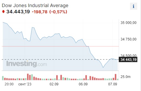 На торгах в среду, 6 сентября, Dow Jones Industrial Average опустился на 0,57% и составил 34 443,19 пункта. Лидерами снижения в индексе, помимо Apple, стали акции Boeing Co., подешевевшие на 2,1%.