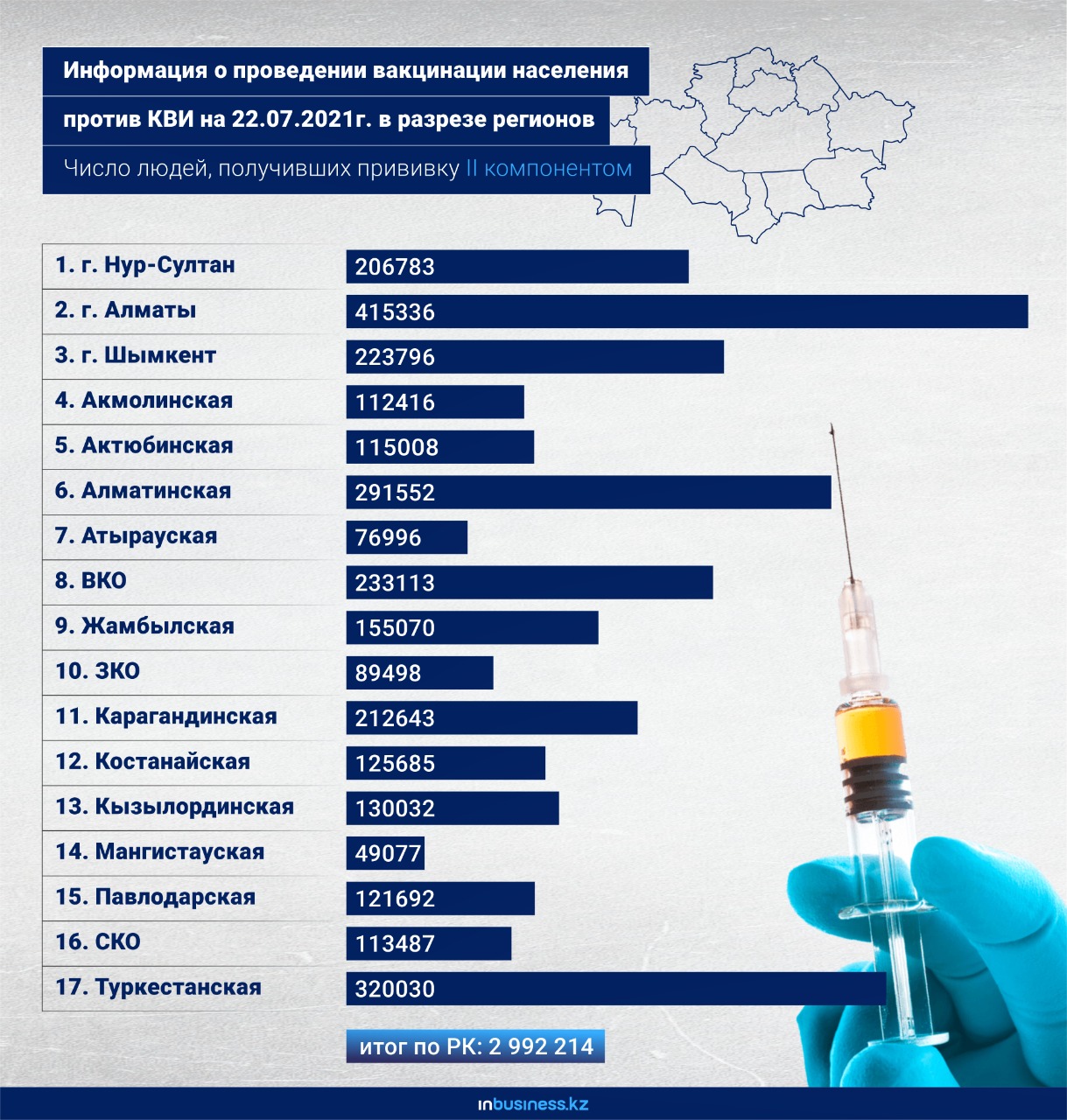 При этом Алматы по прежнему лидирует в Казахстане по количеству привившихся от КВИ. Но в городе имеется только одна из четырех самых популярных в Казахстане видов вакцин – российская "Спутник-V". На 21 июля в наличии в экс-столице был 1 компонент в количестве 29 981 доз, а 2 компонент 109 720 доз.