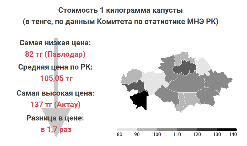 Аналогичная ситуация и с капустой. Цена в Актау в 1,7 раза выше, чем в Павлодаре: 137 и 82 тенге соответственно. Причем оба города лидируют с большим отрывом: во втором по дешевизне городе – Актобе – цена составляет 89 тенге, а в первом среди самых дорогих – Нур-Султане – 121 тенге. При этом средняя стоимость по республике составляет примерно 105 тенге.