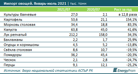 Что касается импорта овощей, с начала года в страну завезли 27 тыс. тонн бахчевых – сразу в 12,8 раза больше, чем за январь-июль 2020 года. Значительно вырос импорт картофеля – в 2,5 раза до 53,6 тыс. тонн, моркови – на 83,3% до 34,4 тыс. тонн, капусты – на 41,6% до 63,8 тыс. тонн, репчатого лука – на 34,3% до 212,2 тыс. тонн, баклажанов – на 25,9% до 2,2 тыс. тонн.