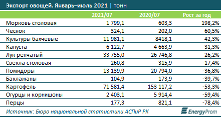 За январь-июль 2021 года из РК отправили на экспорт 1,8 тыс. тонн столовой моркови – в 3 раза больше, чем годом ранее. Сразу на 60,5% до 324,1 тонны вырос экспорт чеснока, на 42,3% до 12 тыс. тонн – бахчевых культур, на 31,3% до 6,1 тыс. тонн – капусты, на 26,2% до 33,8 тыс. тонн – репчатого лука, передает inbusiness.kz со ссылкой на портал energyprom.kz.